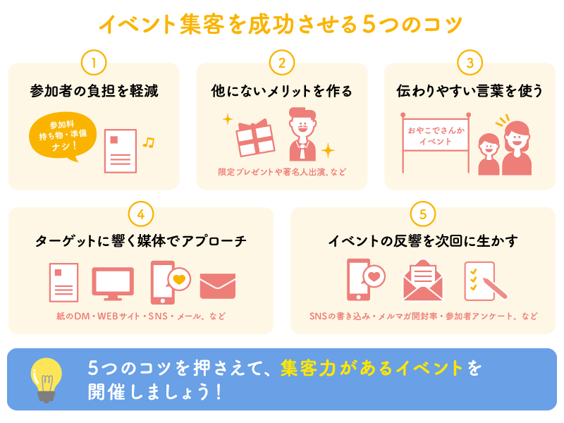 イベント集客で成功するには、ターゲットの明確化やそのイベントならではのメリットを作ることが大切です。