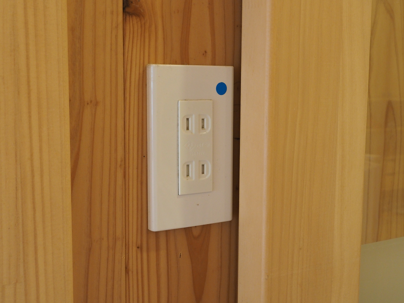 停電時にも利用可能なコンセントには、分かりやすいようにシールで印が付けられている