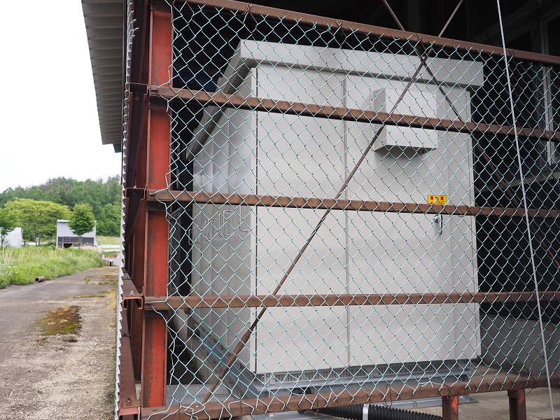 尾花沢市は豪雪地帯であるため、キュービクルは少し高い場所に設置されています。また、近くで遊ぶ子どもたちが中に入らないように、頑丈な柵とフェンスで覆われています。入れ替えの際には、この柵とフェンスを一時的に取り除く必要がありました。さらに立地の問題でクレーンを横付けできないため、人力で機器を移動させなければなりませんでした。