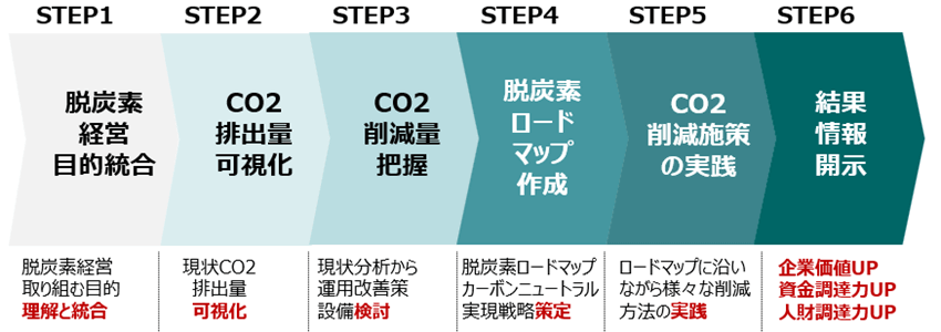 脱炭素経営を進めるにあたっては、以下の流れで取り組んでいきます。