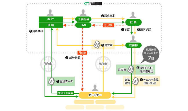 「iネット3」とはどういうものか。ある事業案件があったとする。現場からWEBを介してパートナー企業に見積もり依頼が行くと、相手もWEBで見積もり結果を返してくる。これを、本社のプロジェクトマネジメント部門が精査して社長の判断を仰ぐ。必要なら再交渉も行った上で承認となり、契約書が発行される。