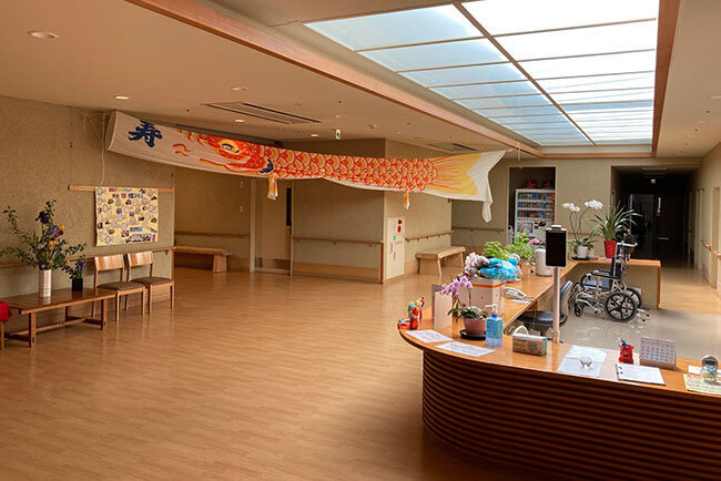 開放的なロビー。近隣からの入所者がほとんどで、家族が気軽に面会に訪れている