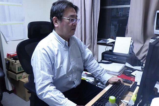 パソコンに向かう齋藤社長。ICT改革と情報発信を進める