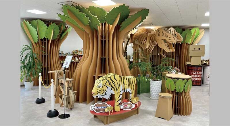 その大きな成果の一つが、段ボールのデザインや段ボールを使った工作キットの販売、集客イベントの企画に取り組んでいる関連企業、hacomo(ハコモ)。工作が大好きな社員が発案してスタートした会社。企業間取引が中心の段ボール業界の中で、消費者向けの商材を扱う企業として存在感が高まっている。TOPの写真は、hacomoが企画して全国の博物館や美術館などのイベントで展示している段ボールで作った作品。工作キットでは年間何千個も売れるシリーズも出ている。