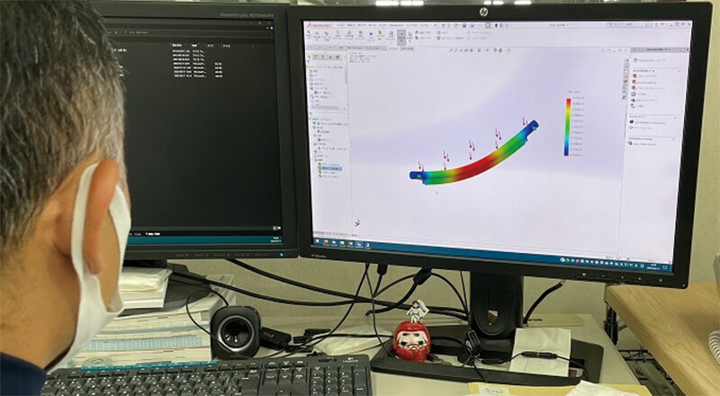 現在は導入段階で、部分的に部品の強度を解析したい場合や3Dでないと図面化が難しい形状の部品の設計に3Dシミュレーションシステムを使っている。「3Dを扱ったことがない社員が多いので、これまでの仕事のやり方を一気に変えてしまうと現場への大きなストレスになってしまいます。社員の負担にならないように、徐々に使用頻度を増やしていきたいと考えています」と兵藤社長。今後様々な可能性を想定しているが、例えば設計、製造してきた部品の強度をシミュレーションシステムで数値化することで、強度が過剰になっていた部分を検証して次の開発に役立てていきたいという。