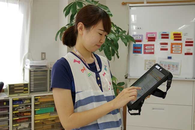 園児たち一人ひとりの毎日の成長記録を作ることも、全体の指導計画や行事計画を作ることも可能。パソコンだけでなくタブレットにも対応していて、保育士たちはケースに入れたタブレットを肩から提げて持ち歩き、その場その場で開いてチェックを行っている。2016年末の導入以前からつくし保育園で働いている保育士の渡辺成美さんも、「何時間とは言えないくらい効率化されました」と便利さを訴える。「園児を帰してからまとめて入力するのではなく、隙間の時間に作業ができるのも嬉しいです」(渡辺さん)