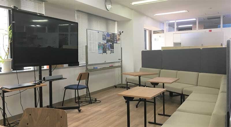 フリーアドレスの職場。左手にハドルスペースが見える。左の奥に見える電子黒板で研修や打ち合わせを行う