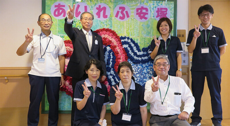 収穫期を迎えた黄金色の田園を横目にトンネルを越えると、ほどなく緑豊かな丘の上に社会福祉法人越後上越福祉会の特別養護老人ホーム「あいれふ安塚」がみえてくる。「ふれあい」をアレンジして命名した「愛をもってふれあう施設」という名前が付いた施設だ。ロボットスーツや見守り介護ロボットなどICTを積極的に取り入れている。導入のねらいは何か。(TOP写真:職員とポーズを取る太田雅俊施設長=後列左から2人目)