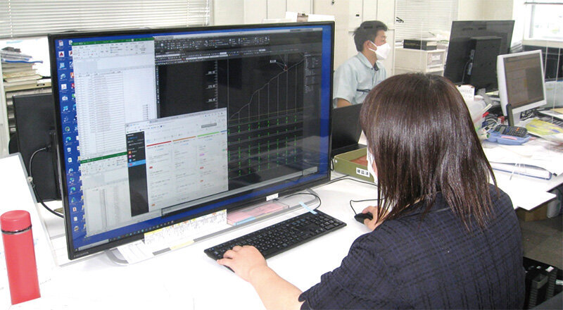 石川県金沢市の株式会社ホクコク地水がコンサルティング事業とICT、デジタル機器の親和性に着目し、積極的な導入を進めている。ICT、デジタル機器を活用することでチーム力を強化し、充実した調査・分析を行うための貴重な時間を生み出している。(TOP写真:大型モニターを備えたパソコンを使って仕事に取り組むコンサルティング部門の社員)