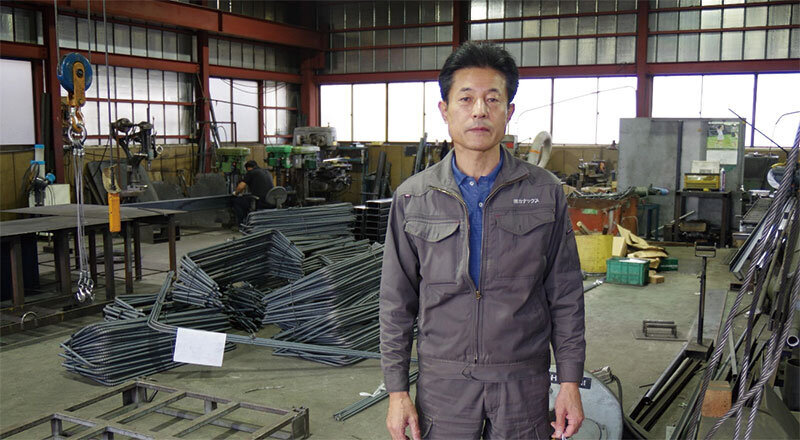 つくばエクスプレスの三郷中央駅から、車で10分ほどの工場が建ち並ぶ一角に、株式会社カナックスの本社がある。工場の入り口には数十センチはある長さのボルトが置かれ、同社が土木工事の現場などで使われるアンカーボルトをはじめとした金属加工製品を手掛ける会社であることをうかがわせる(TOP写真:カナックスの工場と紺野功代表取締役)。