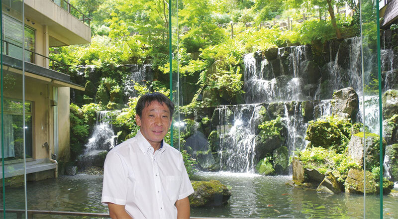 上越新幹線の越後湯沢駅からほど近い高台に建つホテル双葉は、「水が織りなす越後の宿」というテーマにふさわしく、ロビーに入ると滝やせせらぎに出迎えられ、泊まれば幾つもの温泉につかれる和風旅館だ。(TOP写真:滝が望めるホテル双葉のロビーに立つ小林秀雄専務)