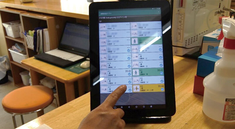 18床のベッドに取り付けられた無線型ナースコールシステムは、職員が持つ8台のスマートフォンと4台のタブレットに連携。入居者がナースコールで職員を呼び出せるのはもちろん、職員のスマートフォンから居室へ声掛けすることもできる。入居者がベッドから降りてマットセンサーを踏んでもコール音が鳴り、スマートフォンやタブレットに居室の映像が送られる。介護記録システムとも連携しており、必要に応じてスマートフォンから手入力で記録を残すことができる。また、タブレットからはナースコールが鳴らなくても、カメラの映像を常時確認できる。このため、各居室の定時確認はナースセンターのパソコンではなく、もっぱらタブレットを活用しているという。
