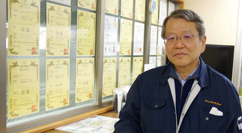 事務所の壁一面に賞状のようなものが貼り出されている。近寄って見ると、すべてが特許を取得したことを証明する特許証。日本のものが多いが、中には韓国や中国、台湾で取得したものも含まれている。一体どれだけの特許を持っているのかを尋ねると、「50以上はあるでしょうね」と答えてくれたのが、様々な装置に使われるローラーと呼ばれる部品の製造や、ロールへのコーティングを行っている株式会社都ローラー工業代表取締役の町田成司氏だ。(TOP写真:都ローラー工業の町田成司代表取締役と壁一面に貼られた特許証)