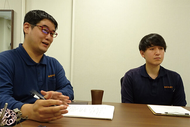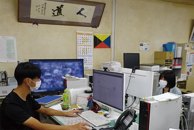企画部ではホームページを毎日のように更新しトピックやイベントを紹介しているが、その中には工場や製造工程などの動画もあり、PRに役立っている。動画制作の経験が長い横田博之さんが映像や音楽を編集して制作した。「好きな仕事ができてやりがいがある」と話すように、若者の感性でものづくりの魅力を伝えられていることが採用活動にも貢献している。2人の話を聞いていると栄和産業の社内の風通しの良さが伝わってくる。