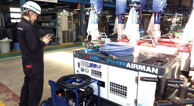 マツオカ建機株式会社(三重県川越町)は、「狭く深く貸す」という独自のビジネスモデルを武器に成長してきた建設機械レンタル会社だ。事業対象をコンビナートや半導体工場、電力施設、地元、など特定の建設現場に絞り、高所作業車から仮設事務所設置、とその備品に至るまで現場で必要なすべてをレンタルするから、顧客の信頼も厚い。創業80年を超える老舗企業でありながら、「挑戦と行動の文化」が根付く若々しい企業でもある。現代の企業にとって「ICTへの取り組みはマストだ」と語る松岡賢代表取締役社長は、経営のデジタル化に社員の幸福度向上と将来への成長を託す。(トップ写真:ハンディターミナルで出荷準備作業を行う整備士。デジタル化で作業時間は大幅に短縮された)