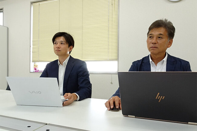 親子2代で物流業務の改革に挑む=右が岡庭伸一社長、左が岡庭大翔氏