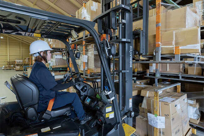 倉庫業務では女性も活躍。安全運転の研修には力を入れている