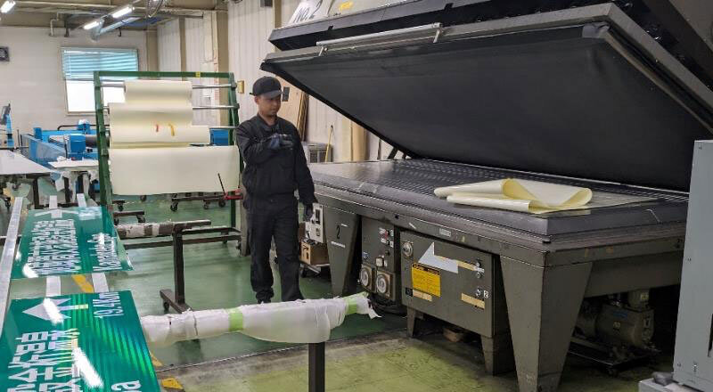 机にパソコンが並ぶ現代風のオフィスから階段を降りると、そこは高度経済成長を支えた活力ある工場だった。道路標識などの製造を手掛ける株式会社九州標識の製造現場。広い空間の中に、整然と機械や部品・材料が並んでいた。(TOP写真:工場内では、従業員が標識板に貼るシートの加工を行っていた)