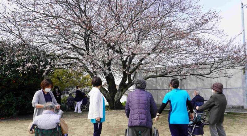 医療法人社団健成会(香川県観音寺市)を設立した河田健介理事長の先祖は幕末、牛痘苗による天然痘ワクチン接種を日本に広めた蘭学医、緒方洪庵の適塾で学んだという。「洪庵の時代から約200年にわたり先祖代々『人命を救いたい』という志を受け継ぎ、その時々に見合った医療を心がけてきました」と河田理事長。(TOP写真:近くの公園で花見を楽しむ介護老人保険施設「かわた」の入所者と介護職員)