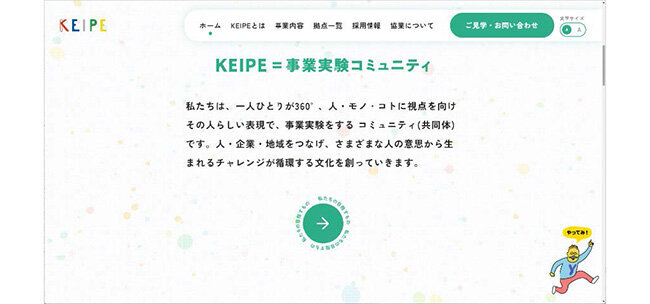 2024年5月には会社の理念と取り組みをよりわかりやすく伝えるためにホームページをリニューアルした。ブランドアイデンティティの「360° CHALLENGE COMMUNITY」をトップページに表示した上で、各事業の取り組みを説明したページにアクセスしやすいようにレイアウトを改めた。ホームページと連動して多様な働き方を探究するオウンドメディア「やってみラボ」も運営し、KEIPEで取り組んでいる事業や採用情報といったトピックを記事形式で配信している。