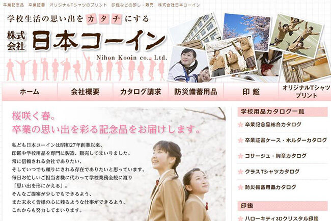 山梨県甲府市に本社を置いて、北は北海道から南は九州・沖縄にいたる全国の学校を対象に、卒業記念品などを販売している会社が株式会社日本コーインだ。印鑑や卒業証書を入れるケース、校章入りのモバイルバッテリーにマグカップといった多彩なアイテムをそろえて、寄せられる注文に応えている。最近は、データ共有を行って過去のデータをスムーズに参照できるようにしたり、東京と大阪にある営業拠点と常時接続し、いつでもWeb会議での打ち合わせを可能にして、顧客サービスの充実を進めている。(TOP写真:日本コーインのTシャツのオンライン販売サイトより)