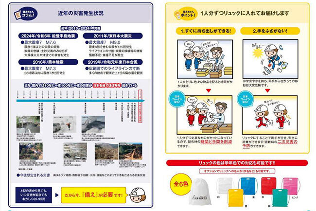 一般企業向けや家庭向けに防災用品をセットにして販売している会社はあったが、「学校向けはあまりありませんでした。当社にはそうした学校に対するネットワークがあるため、販路として広げていくことができました」(小宮山社長)。非常食や飲料水から簡易寝袋、カイロ、携帯トイレなどを1人分リュックにまとめたセットを用意。これを生徒が入学時に購入すれば、在学中の災害に備えることができる。