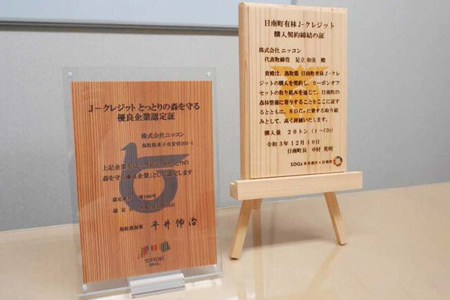 鳥取県の森林保全に貢献したいという思いで購入したという。本社では日南町の木材で製作したJ-クレジット購入契約締結の認定証とともに、鳥取県の「J-クレジットとっとりの森を守る優良企業」の認定証が飾られている。環境だけでなく、地域の高校の部活動やイベントへの支援を通じて地域活性化にも貢献していきたいという。