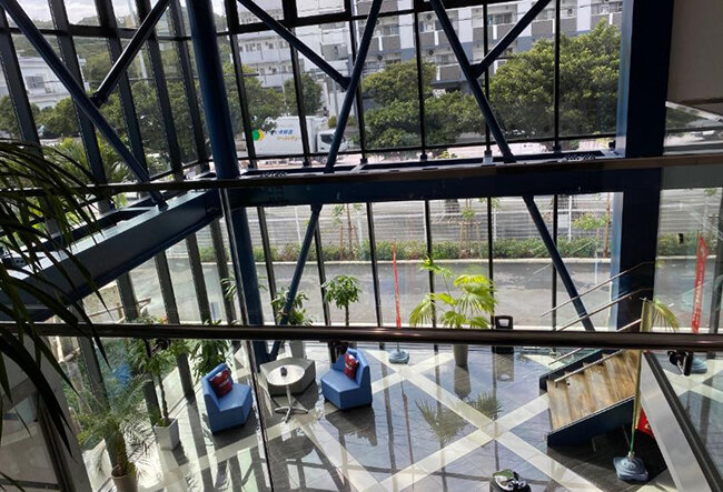 2階からエントラスを見る。仲本工業の特徴である鉄鋼が鮮やかなデザインで使われている