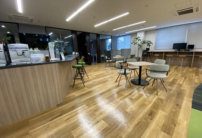 部門間の連携を考えたミーティングデスクを配置したフリースペース