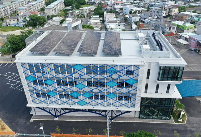 新社屋は省エネ効果が高いネットゼロエネルギービルとして建設した。国土交通省による建築物省エネルギー性能表示制度(BELS)の認証を取得している。すべての照明に環境負荷が少ないLEDを導入。屋上には144枚の太陽光発電パネルを設置して年間電力使用量の約20%をまかない、蓄電池ユニットも配置している。太陽光発電パネルは、沖縄の強い日差しからの遮熱効果を、4階部分にもたらしており、建物の空調負荷低減にも貢献している。駐車場の一角には電気自動車の充電スペースを設け、災害や停電の発生時には、電気自動車から社屋内に電力の供給を行えるようにしている。さらに、災害時の一時避難施設としての受け入れや応援に関する協定を沖縄市と締結したり、事業継続のためのBCP(事業継続計画)の認定取得を行い、地域の防災・減災対策の協力体制を整えている。