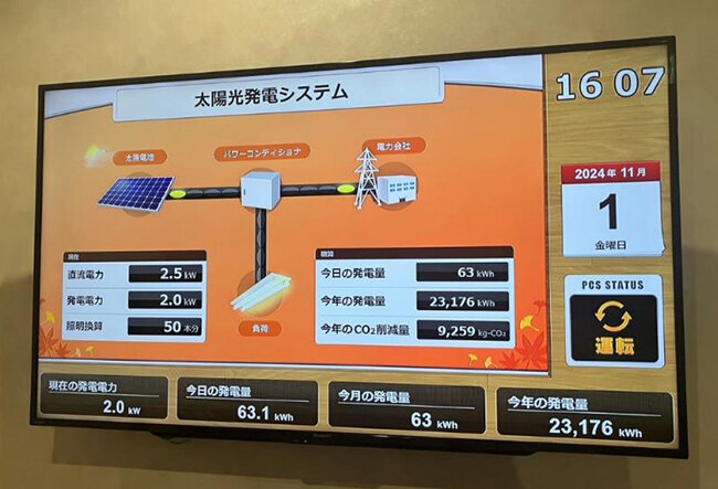 3階エントランス部分では太陽光の発電量をモニターで確認できるようにしています