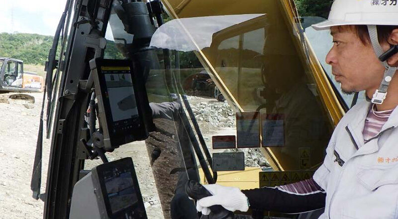 岡山県倉敷市真備町に本社を構え、地域密着で土木工事と建設機械のリースを営む株式会社オカジュウは、情報通信機能を備えた建設機械、ICT建機の活用に積極的な企業として知られている。2018年7月の西日本豪雨では、被害を受けた地域の復旧工事に全社を挙げて尽力した。トップが率先垂範してICT建機を活用することで、会社全体で建設DXを推進する意識を育み、生産性と施工品質の向上につなげている。(TOP写真: ICT建機の操縦席でモニタを確認しながら操作している様子)