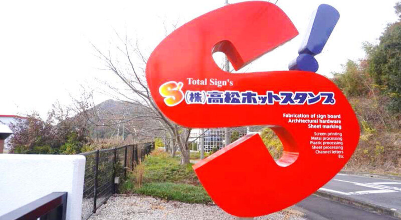 香川県に拠点を置く株式会社高松ホットスタンプは、半世紀を超える歴史を持つ四国を代表する看板製作企業だ。箔押し(ホットスタンプ)を手掛ける特殊印刷の会社からスタートし、顧客の要望に応じて事業分野を拡大していった。表札から自立型看板、壁面看板、袖看板、LEDサイン、懸垂幕、横断幕まで大小さまざまな看板製品を取り扱っている。2024年7月には創業家出身の30代前半の新社長が就任。若きリーダーの舵取りの下、新型の工作機械やICTを活用して受注生産型から企画提案型へビジネスモデルの転換を図ろうとしている。(TOP写真:高松ホットスタンプの自社のサイン(看板)。自社商品アピールに大きな効果)