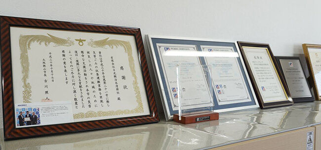 日光クリーングループが行っている地域貢献活動などに贈られた数々の感謝状
