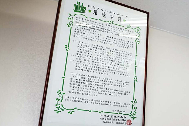 SDGsに関連した日光産業の取り組みは多岐にわたっている。環境に配慮した企業活動として、すべての収集車に排ガス浄化装置を装備しているほか、毎月、環境管理委員会を開催して自社の活動が環境に与える影響を検証している。収集車ごとの日報作成をデジタル化して業務のペーパーレス化に取り組む一方、2025年1月には自社の建物で使う電力を再生可能エネルギーでまかなうために太陽光発電システムを設置した。また、事務用車両を電気自動車にしている。