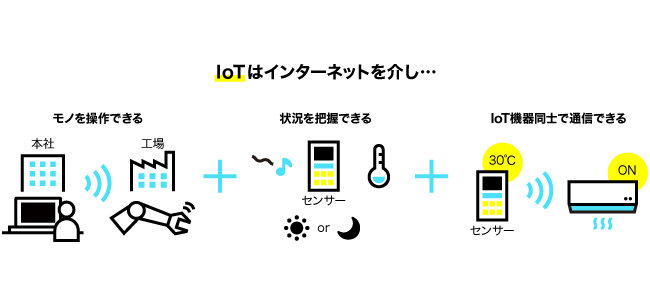 1つ目は「モノを操作できる」ことです。外出先からエアコンを操作するように、IoTに対応している機器をネットワーク越しに操作できます。工場にある機器を外部から操作するだけでなく、人が入れないような危険な場所でも、機器を動かすことができます。