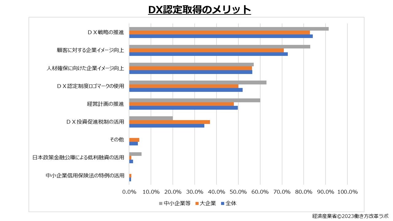 経済産業省が発表したDX認定事業者のアンケートでは、DX認定取得のメリットとして上位に「DX戦略の推進」、「顧客に対する企業イメージ向上」が挙げられました。これらは企業の規模問わず上位を占めており、共通するメリットといえるでしょう。
