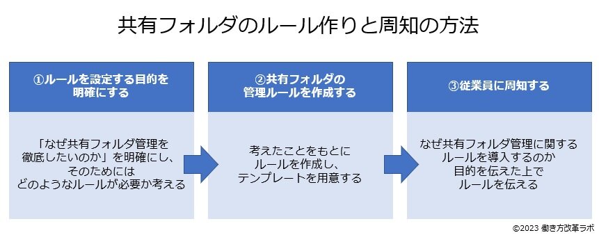 最後に、共有フォルダのルール作りから従業員に周知するまでの流れをまとめました。共有フォルダのルールを導入したい方は、ぜひご参照ください。