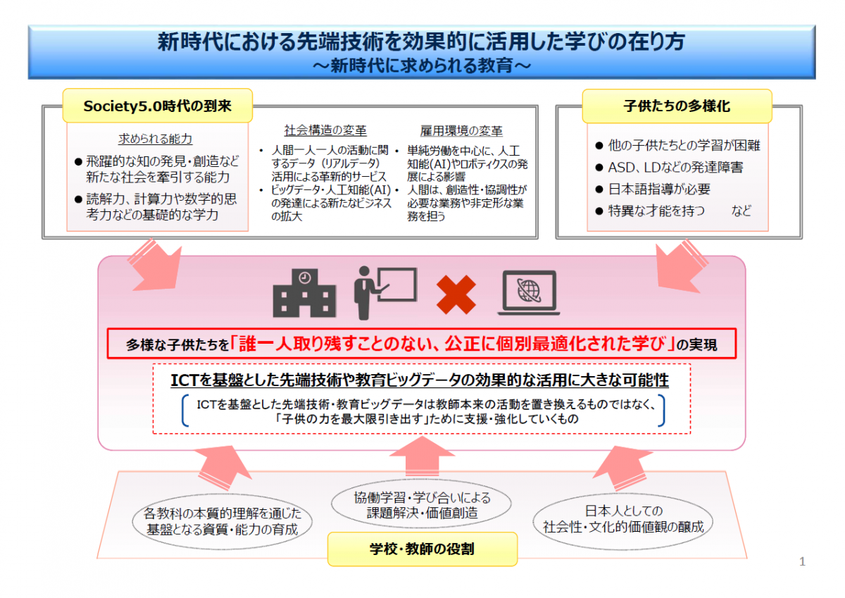 子どもたちが、Society 5.0(狩猟社会、農耕社会、工業社会、情報社会に続く新たな社会)時代を担う上で、ICTを基盤とした先端技術の習得は欠かせません。また時代の変化の中、多様な子どもたちに対して個別最適化された創造性を育む公正な教育が重要です。その実現のため、ICTを効果的に活用することが求められています。