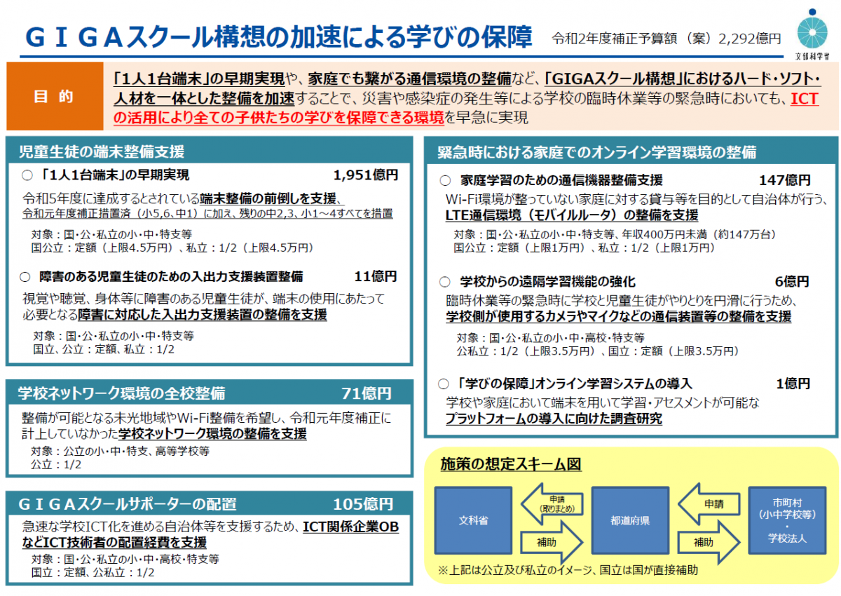 なお、新型コロナウイルス感染症の感染拡大で学校教育課程に支障が生じたことを受けて、令和2年度補正予算案で、GIGAスクール構想の早期実現のための予算が計上されました。ICT環境整備を加速することで、非常時の臨時休校などの事態においても、ICTの活用で全国の子どもたちに学びを保障できる環境を早い段階で実現することを目指しています。