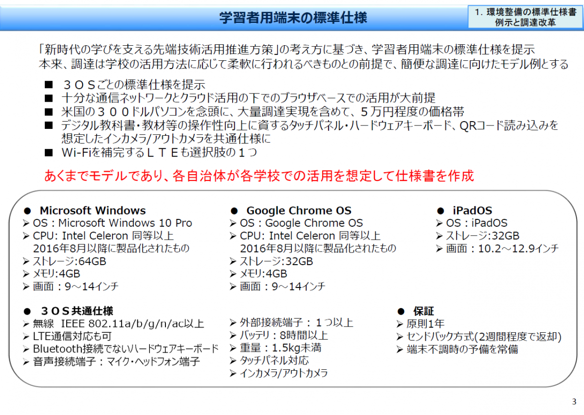 端末の標準仕様、校内LAN整備の標準仕様を例示し、都道府県レベルでの共同調達を推進。