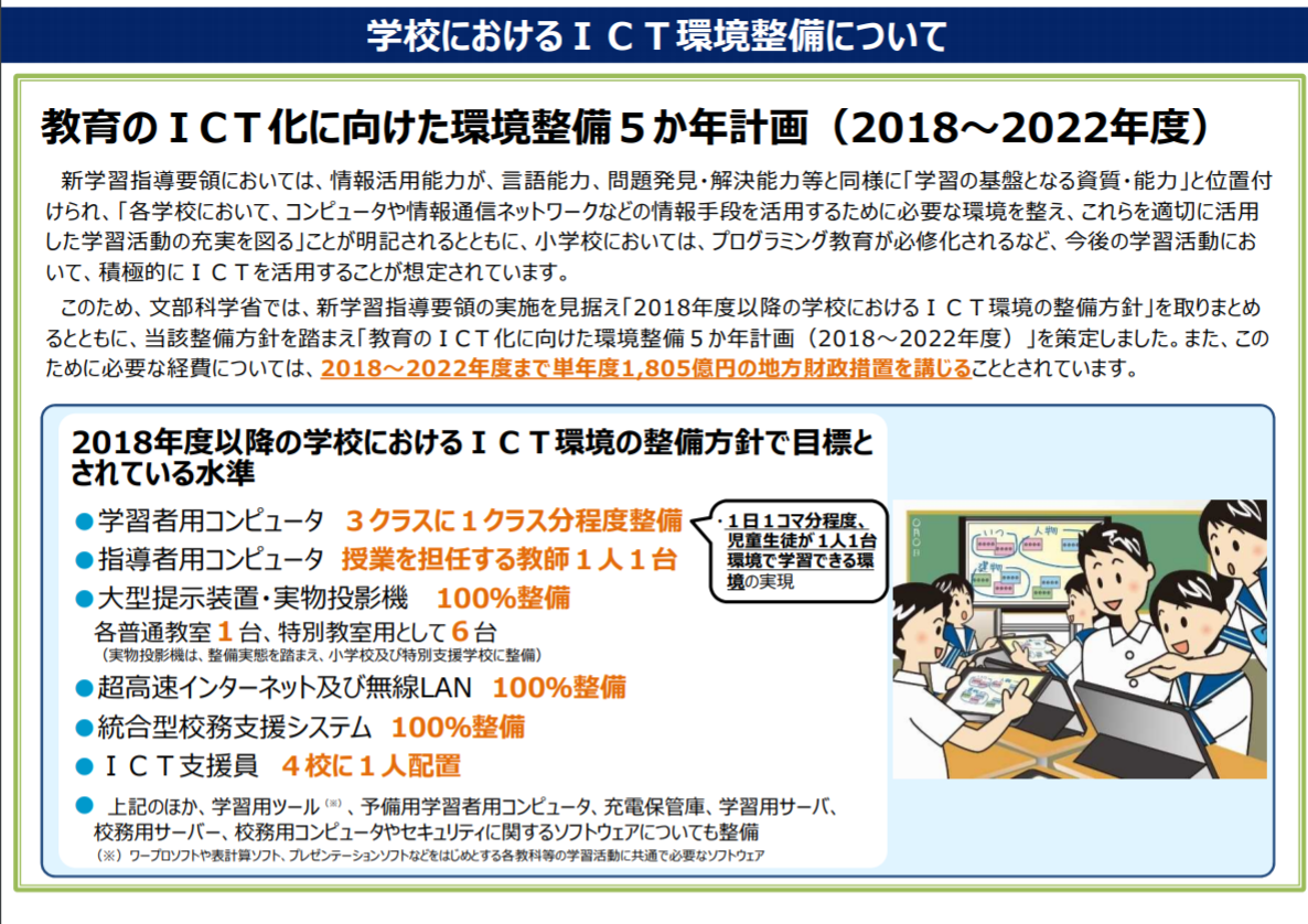 新学習指導要領の実施を見据えて策定された、「教育のICT化に向けた環境整備5か年計画(2018~2022年度)」は、2018年度以降に実現するICT環境整備の水準として、学習者用コンピューターを3クラスに対して1クラス分ほど整備する、超高速インターネット及び無線LANを100%整備するなどの目標が定められ、GIGAスクール構想と同時並行で進められています。