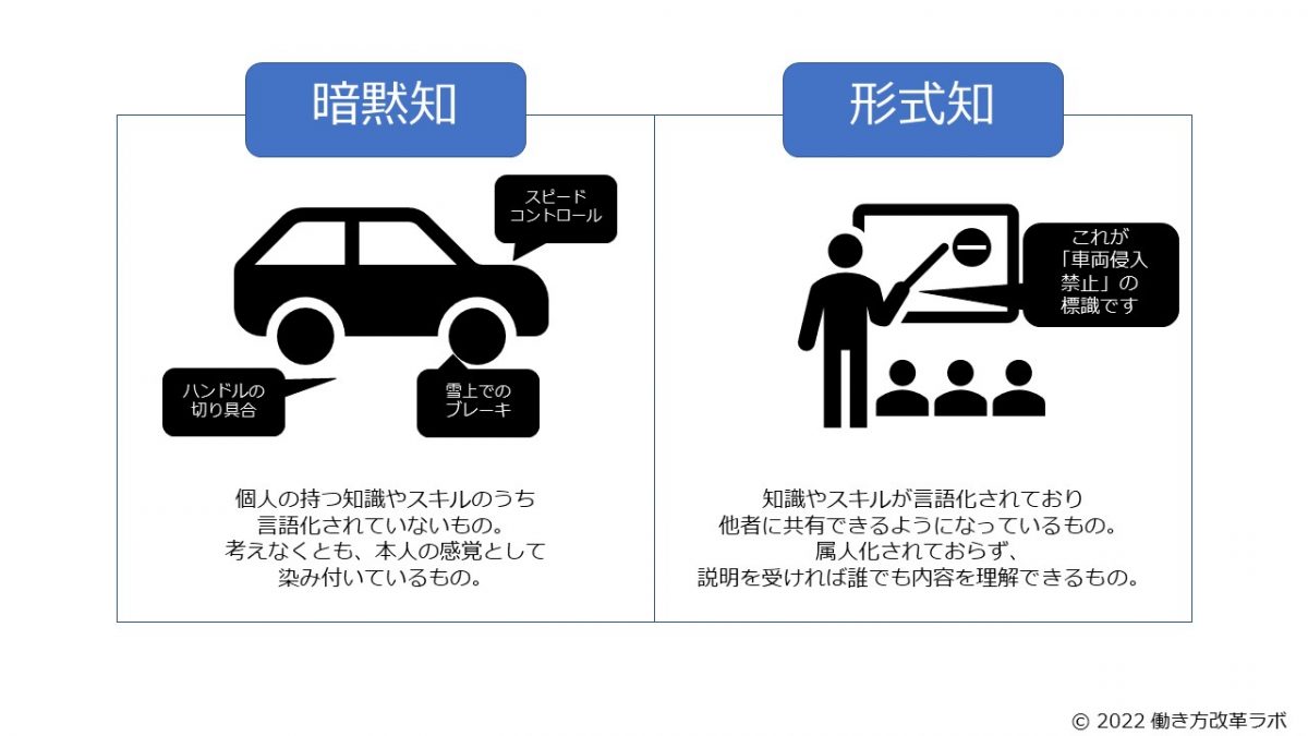 ナレッジマネジメントを理解する上で欠かせないのが、言語化されていない知識やスキルを意味する「暗黙知」と言語化されている「形式知」です。