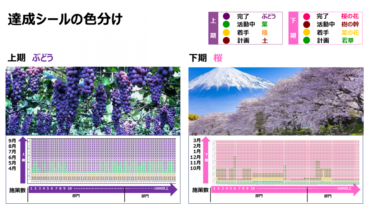 組織統合前の2015年から福島事業所で始まったのが、各部門のKPI進捗を一面に表現した「千本桜」です。この千本桜は、改善施策ごとに着手から完了まで段階的に色分けし、施策完了時点以降を桃色(桜)で表示、効果の刈取り期間を桃色の面積で表現しました。この活動を通じ、「千本の桜を早く満開にしよう!」と部門・社員の目標達成に向けた意識が変わりました。