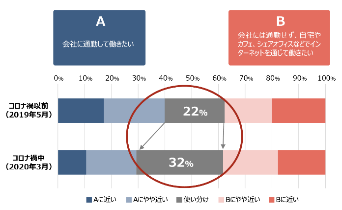 新型コロナウイルスの流行前と比べて「会社に通勤して働きたい」という人が減少し、通勤とテレワークを「使い分けたい」と考える人が10%増加していることがわかります。一方、「会社には通勤せず、自宅やカフェ、シェアオフィスなどでインターネットを通じて働きたい」という人の増減は目立ちません。
