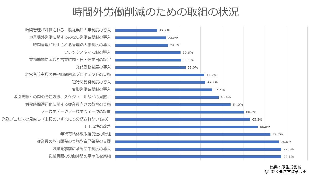 このことから、時間外労働を削減するために有効な取り組みとしてノー残業デーを導入する企業が多く存在していることがわかります。また、働き方改革関連法が施行された2018年よりも前の資料であることから、現在はより導入企業が増えていると考えられます。