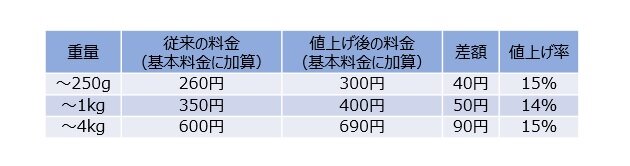 25g以下のもとの料金は84円であり、26円が上乗せされて31.0%の値上げです。一方、50g以下のもとの料金は94円で、これに16円上乗せされて17.0%の値上げとなります。