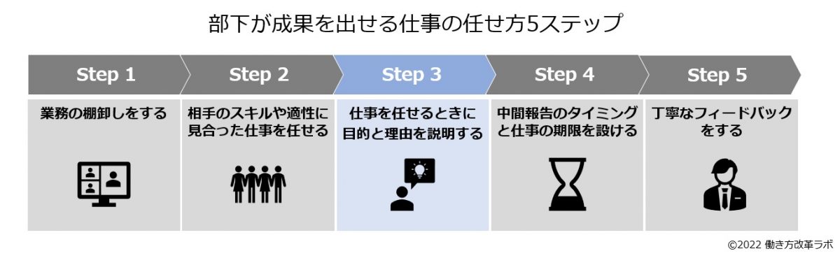 また、理由に関しては、部下や後輩のモチベーションにも関係する大切な部分です。「あなたのこういうところを信頼しているから任せた」と言葉にして伝えることで、意欲的に取り組みやすくなります。