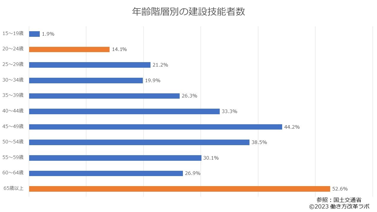 建築業界は、ほかの業界と比べても高齢化が進行しています。国土交通省の「年齢階層別の建設技能者数」(令和3年度平均)によると、建設業就業者のうち、65歳以上は52.6%、20〜24歳は14.1%と、大きく差が開いています。