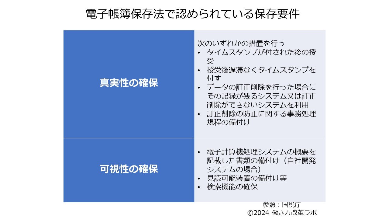 上述した保存区分に共通して、電子帳簿保存法で認められている保存要件は下記の2つです。